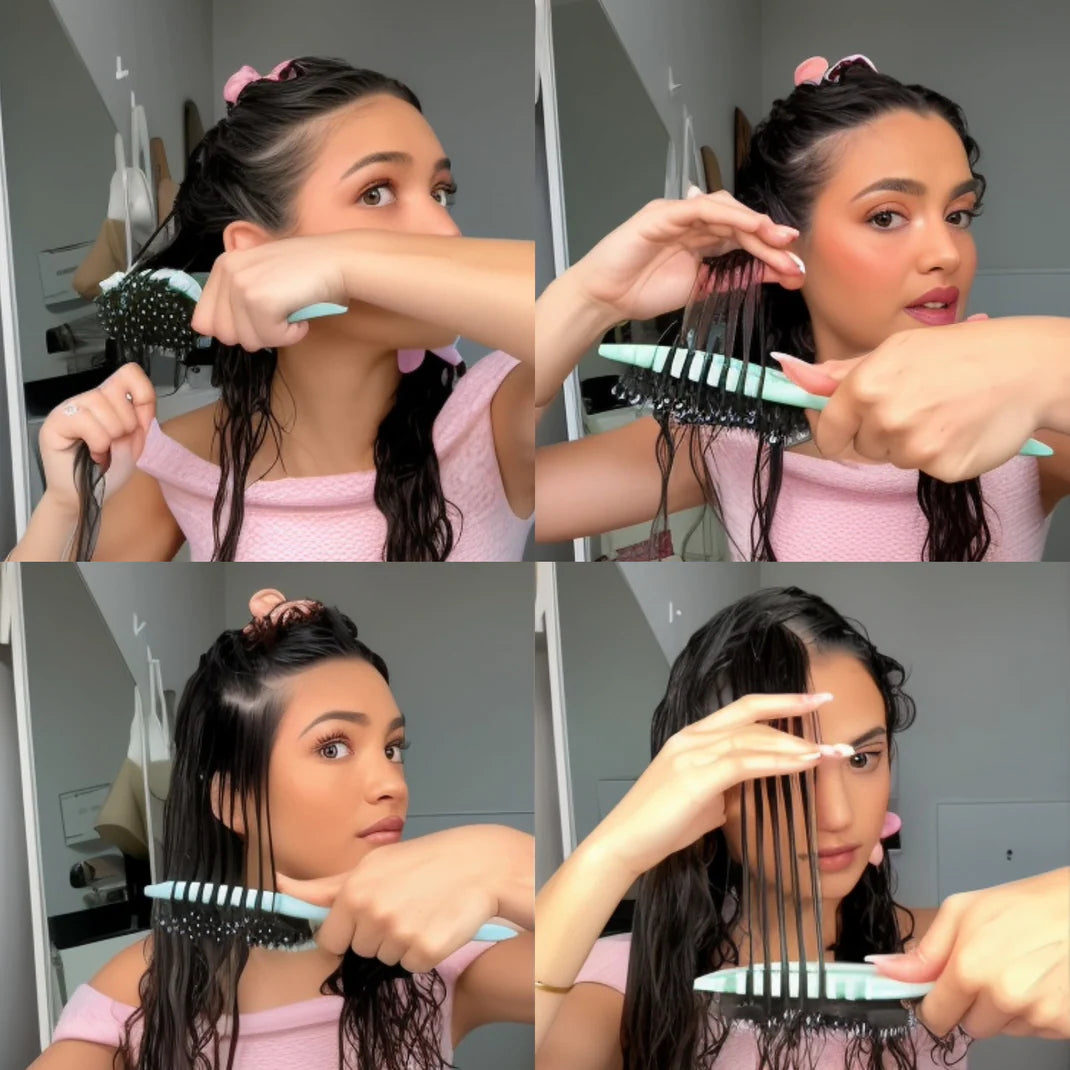 Start with damp curls and your favorite product.Brush downward slowly, and you’ll see your curls instantly pop into smooth, shiny clumps.It's effortless—and oddly satisfying.